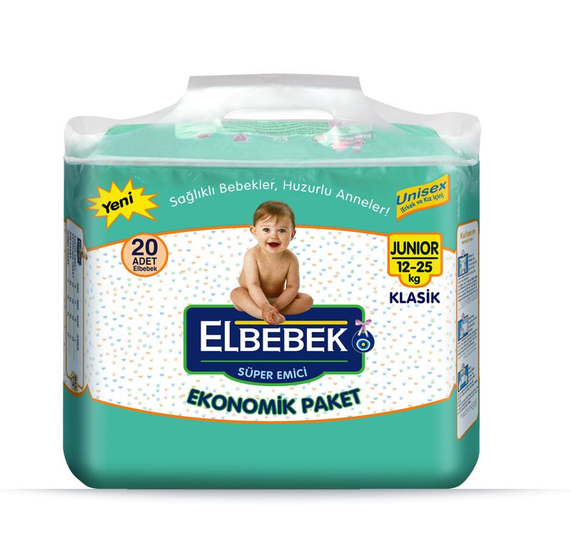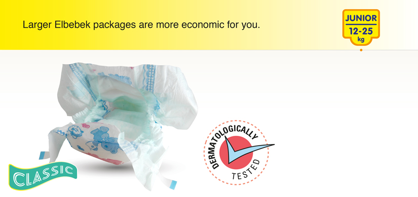 Elbebek Classic Diapers accompanies your baby at every moment as from the birth of your baby and during your baby’s development with its different sizes designed according to your baby’s weight. Proceeding on its way with the slogan “Healthy babies, peaceful moms”, Elbebek Diapers enables your baby to both play happily during the day and sleep uninterruptedly during the night by providing the dryness your baby needs. Thanks to its extra dry layer, this diaper keeps you baby’s bottom dry night and day, thus helping the babies sleep uninterruptedly in peace and wake up in a happy mood. On account of the narrow anatomic cut of Elbebek between the legs which prevents the accumulation of the diaper between the legs and enables ease of walk, the movements of babies trying to crawl and walk all day are not restricted. Elbebek quickly absorbs the liquid and transfers to the inner layer, spreading the liquid thanks to its diffuser layer and locking in the gels.With its high absorbent capacity, it can absorb and lock in more liquids. This diaper can harmonise perfectly with your baby’s body and takes the shape of your baby’s body. Thanks to ELBEBEK CLASSIC BODY SHAPED feature, your baby’s movements are not restricted, providing limitless freedom of action for your baby. This diaper prevents all leakages by means of its barriers. Elbebek’s specially designed surface keeps your baby’s sensitive skin rash-free! With Elbebek, the babies are always smiling and mothers are always at ease!