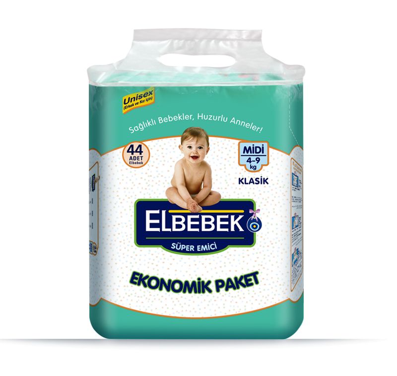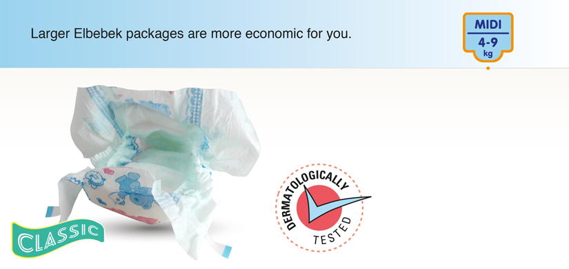 Elbebek Classic Diapers accompanies your baby at every moment as from the birth of your baby and during your baby’s development with its different sizes designed according to your baby’s weight. Proceeding on its way with the slogan “Healthy babies, peaceful moms”, Elbebek Diapers enables your baby to both play happily during the day and sleep uninterruptedly during the night by providing the dryness your baby needs. Thanks to its extra dry layer, this diaper keeps you baby’s bottom dry night and day, thus helping the babies sleep uninterruptedly in peace and wake up in a happy mood. On account of the narrow anatomic cut of Elbebek between the legs which prevents the accumulation of the diaper between the legs and enables ease of walk, the movements of babies trying to crawl and walk all day are not restricted. Elbebek quickly absorbs the liquid and transfers to the inner layer, spreading the liquid thanks to its diffuser layer and locking in the gels.With its high absorbent capacity, it can absorb and lock in more liquids. This diaper can harmonise perfectly with your baby’s body and takes the shape of your baby’s body. Thanks to ELBEBEK CLASSIC BODY SHAPED feature, your baby’s movements are not restricted, providing limitless freedom of action for your baby. This diaper prevents all leakages by means of its barriers. Elbebek’s specially designed surface keeps your baby’s sensitive skin rash-free! With Elbebek, the babies are always smiling and mothers are always at ease!