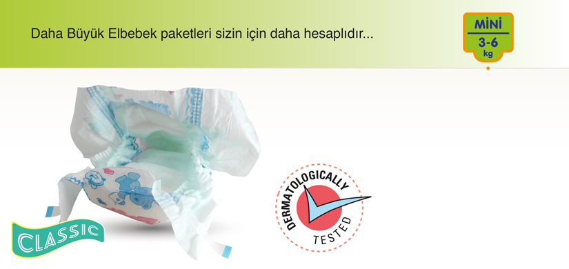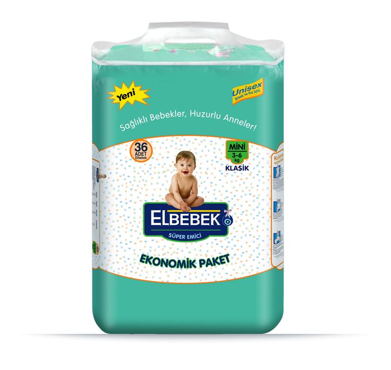 Elbebek Classic Diapers accompanies your baby at every moment as from the birth of your baby and during your baby’s development with its different sizes designed according to your baby’s weight. Proceeding on its way with the slogan “Healthy babies, peaceful moms”, Elbebek Diapers enables your baby to both play happily during the day and sleep uninterruptedly during the night by providing the dryness your baby needs. Thanks to its extra dry layer, this diaper keeps you baby’s bottom dry night and day, thus helping the babies sleep uninterruptedly in peace and wake up in a happy mood. On account of the narrow anatomic cut of Elbebek between the legs which prevents the accumulation of the diaper between the legs and enables ease of walk, the movements of babies trying to crawl and walk all day are not restricted. Elbebek quickly absorbs the liquid and transfers to the inner layer, spreading the liquid thanks to its diffuser layer and locking in the gels.With its high absorbent capacity, it can absorb and lock in more liquids. This diaper can harmonise perfectly with your baby’s body and takes the shape of your baby’s body. Thanks to ELBEBEK CLASSIC BODY SHAPED feature, your baby’s movements are not restricted, providing limitless freedom of action for your baby. This diaper prevents all leakages by means of its barriers. Elbebek’s specially designed surface keeps your baby’s sensitive skin rash-free! With Elbebek, the babies are always smiling and mothers are always at ease!