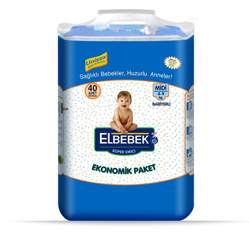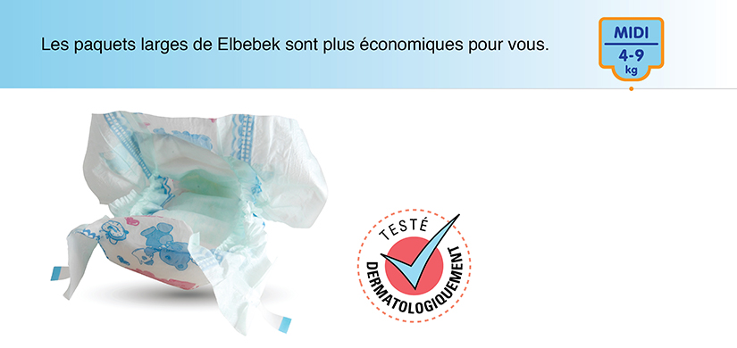 Les couches Elbebek accompagne votre bébé à tous moments à partir de la naissance de votre bébé et au cours de son développement avec ses différentes tailles fabriqué selon le poids de votre bébé.Suivant son slogan"Bébé en santé , mères sereines", Elbebek permet votre bébé de jouer joyeusement pendant la journée et de dormir sans interruption pendant la nuit en octroyant l'humidité dont votre bébé a besoin. Grâce à sa couche extra humide,la couche conserve le bas de votre bébé humide nuit et jour,cela permettant au bébé de dormir sans interruption en paix et de se réveiller en bonne humeur.En comptant sur l'étroitesse beauté anatomique de Elbebek entre les pieds ce qui prévient l'accumulation de la couche entre les pieds et facilite ainsi la marche,les mouvements du bébé qui essaie de ramper et marcher toute la journée ne sont pas restreint. Elbebek absorbe rapidement le liquide et le transfère à la couche interne, diffusant le liquide grâce à sa couche de diffusion interne antivirus l'enfermant dans les gels.Avec sa grande capacité d'absorption il peut absorber et renfermer plus de liquide.La couche peut être en harmonie parfait avec le corps de votre bébé et prendre la forme du corps de votre bébé. Grâce à la spécialité de FORME DE ELBEBEK ,les mouvements de votre bébé ne sont pas restreint, permettant une liberté d' action à votre bébé. Cette couche prévient toute fuite aux moyens de ses barrières.La surface spécialement designer de Elbebek garde libre et impulsive la sensibilité de la peau de votre bébé. Avec Elbebek les bébés sont toujours souriant et les mamans à l'aise.