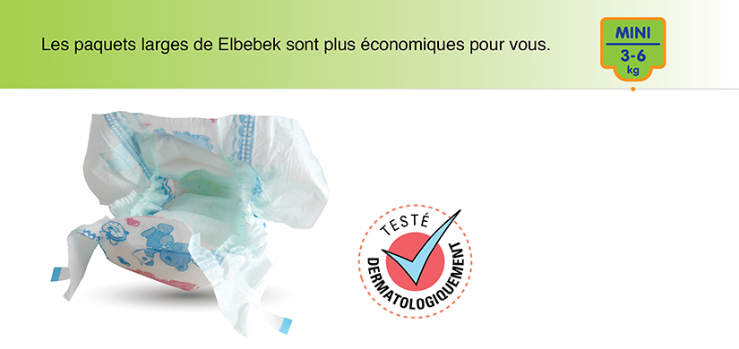 Les couches Elbebek accompagne votre bébé à tous moments à partir de la naissance de votre bébé et au cours de son développement avec ses différentes tailles fabriqué selon le poids de votre bébé.Suivant son slogan"Bébé en santé , mères sereines", Elbebek permet votre bébé de jouer joyeusement pendant la journée et de dormir sans interruption pendant la nuit en octroyant l'humidité dont votre bébé a besoin. Grâce à sa couche extra humide,la couche conserve le bas de votre bébé humide nuit et jour,cela permettant au bébé de dormir sans interruption en paix et de se réveiller en bonne humeur.En comptant sur l'étroitesse beauté anatomique de Elbebek entre les pieds ce qui prévient l'accumulation de la couche entre les pieds et facilite ainsi la marche,les mouvements du bébé qui essaie de ramper et marcher toute la journée ne sont pas restreint. Elbebek absorbe rapidement le liquide et le transfère à la couche interne, diffusant le liquide grâce à sa couche de diffusion interne antivirus l'enfermant dans les gels.Avec sa grande capacité d'absorption il peut absorber et renfermer plus de liquide.La couche peut être en harmonie parfait avec le corps de votre bébé et prendre la forme du corps de votre bébé. Grâce à la spécialité de FORME DE ELBEBEK ,les mouvements de votre bébé ne sont pas restreint, permettant une liberté d' action à votre bébé. Cette couche prévient toute fuite aux moyens de ses barrières.La surface spécialement designer de Elbebek garde libre et impulsive la sensibilité de la peau de votre bébé. Avec Elbebek les bébés sont toujours souriant et les mamans à l'aise.