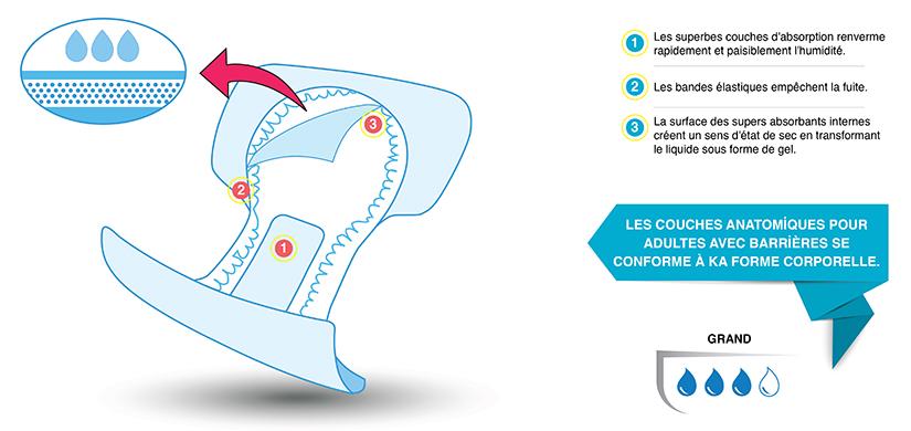 İl vous permet de vous mouvoir avec son design confortable. Grâce à sa structure spéciale d'absorption,il renferme complètement le liquide et protège votre peau. Les bandes flexibles qui peuvent être ouvert et fermé encore et encore se conforme facilement et couvre votre corps. Avec son usage facile et son design confortable,les couches anatomiques pour adultes de Özbey ont été fabriquées pour vous faciliter la vie. Spécialement conçu pour les patients qui urinant sur eux-mêmes ,les patients ambulatoires et les femmes après l'accouchement,les couches anatomiques pour adultes de Özbey est salutaire avec sa haute capacité, un pouvoir absorbant , barrières et conformité complète avec la forme corporelle grâce à sa SPÉCİALİTÉ DE CONFORMİTÉ CORPORELLE.